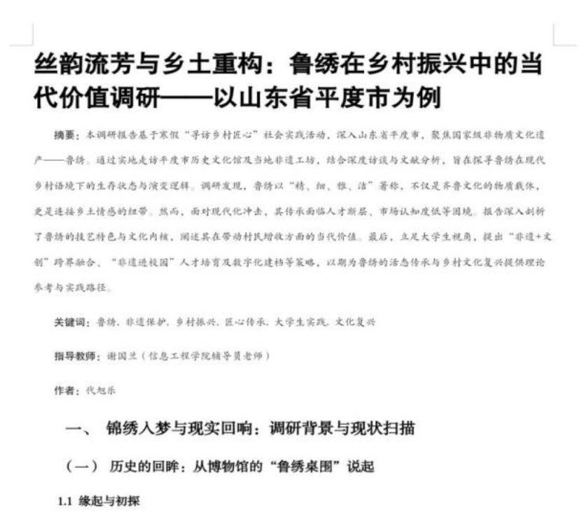 一针一线绣非遗,一言一行助振兴。通信工程231班代旭乐前往山东平度,开展21天鲁绣专项调研。他走访调研“公司+农户”就业增收模式,深入梳理鲁绣传承痛点,撰写调研报告并提出发展建议,以“非遗+文创”设计与宣传推广,为鲁绣活态传承、乡村增收贡献青年智慧。